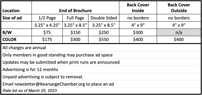 Email your ad requests to newsletter@KearsargeChamber.org. Brochure content updates will be done at the next scheduled update unless the additional setup fee is being paid.